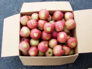 Новую разновидность яблок сорта Фуджи вырастил некий японский фермер. Прямо на кожуре у них красуется логотип компании Apple и схематичное изображение iPod. Для получения такого эффекта на созревающие яблоки были наклеены стикеры в форме яблока и изображения iPod, препятствующие попаданию солнечного света на этот участок плода. По мере созревания на яблоках сформировалось силуэтное изображение знакомого логотипа. Фермер снял урожай, фрукты были тщательно упакованы и отправлены куда-то... хочется думать, в магазины в непосредственной близости от штаб-квартиры Apple. Дизайнерские плоды продаются в некоторых японских Internet-магазинах. Невольно возникает вопрос - сколько этих яблочек появится на eBay« Вот бы они до той поры не испортились...